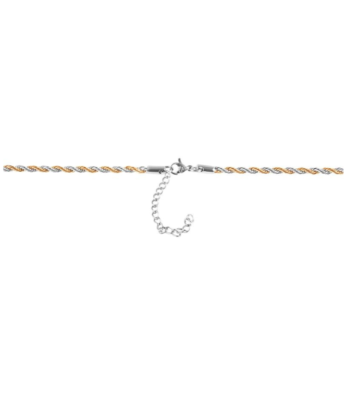Die Akzent Kordelkette Edelstahl besticht durch ihr klassisches Kordelmuster und die hochwertige Verarbeitung. Zwei einzelne Kettenstränge sind kunstvoll miteinander verdreht und erzeugen ein markantes, elegantes Muster, das der Kette ein unverwechselbares Aussehen verleiht. Die Kombination aus silberfarbigen und roségoldfarbenen Edelstahlsträngen sorgt für einen modernen, stilvollen Look, der zu zahlreichen Outfits passt.
