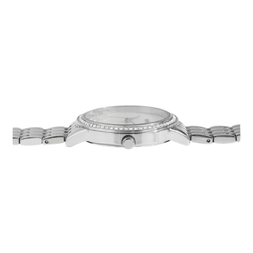 - Elegantes Perlmutt-Zifferblatt mit dezenten Similisteinen